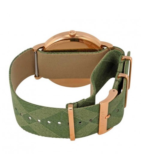 Men's watch with quartz movement, T-Classic collection by Tissot, Everytime Large model T1096103803200, is an original vintage-style men's timepiece with green leather strap. The detail that immediately catches the eye are the clearly visible Arabic numerals of the watch and the dark hands that contrast perfectly with the white dial. The case is in rose gold stainless steel with a polished finish. The watch is equipped with a very scratch-resistant sapphire crystal and a base seal of 30 M. The entire composition is underlined by the Tissot logo in a characteristic lettering. It is an ideal solution for those who love original accessories.