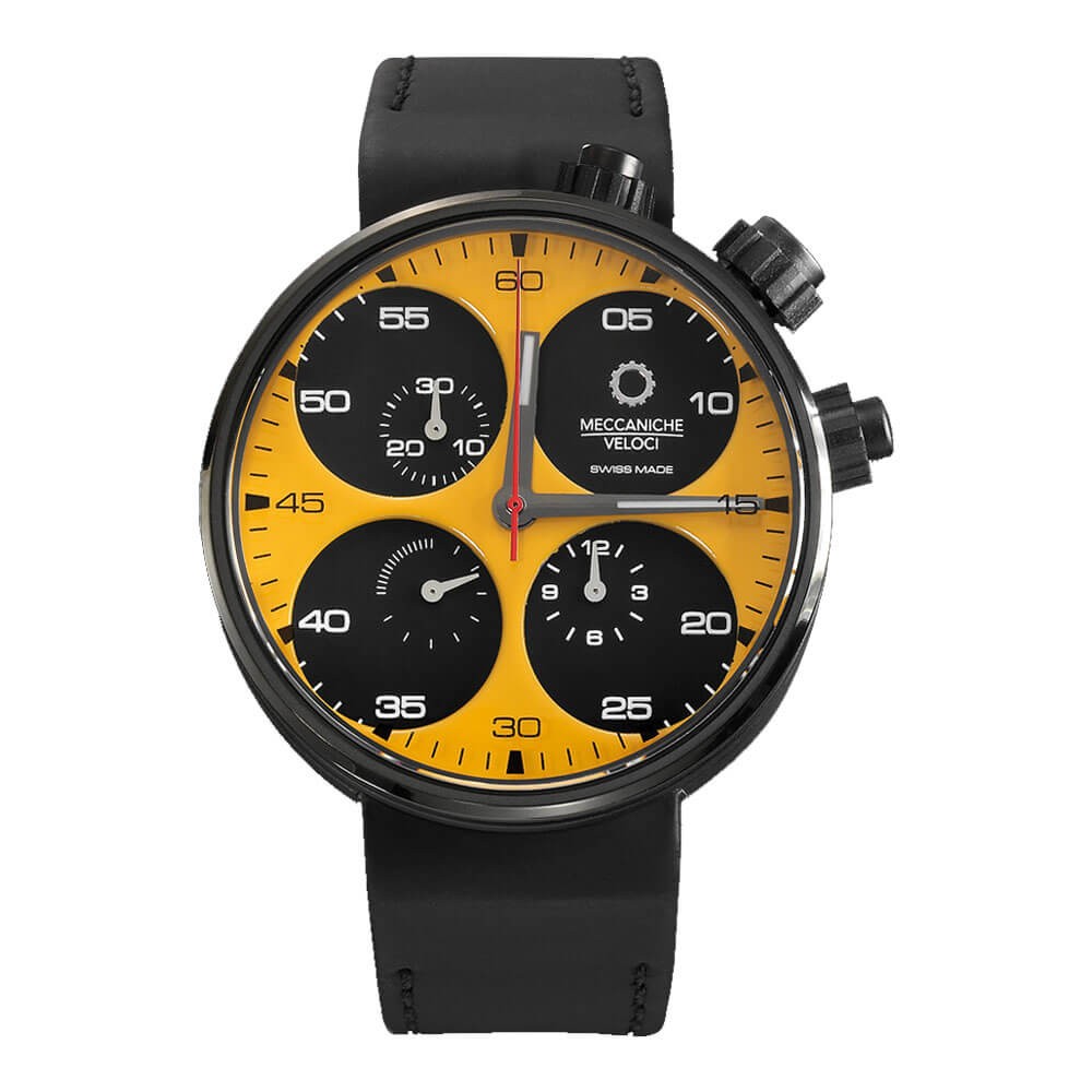 W123K141 Meccaniche Veloci QuattroValvole44: modern, trendy with a strong character. This ultramodern watch is perfect for any occasion: for everyday use, for business meetings and for evening outings. The heart of the watch is a unit with a precise quartz movement, the water resistance class is 5 ATM (50m) and has a very useful chronograph function. Comfort in everyday use is guaranteed by lacing on a black rubber strap. The dial in a rare yellow and black texture attracts attention. The watch comes with a two year warranty with an extra year for the movement. This model is an ideal proposal for men who want to look elegant and dignified at any time.