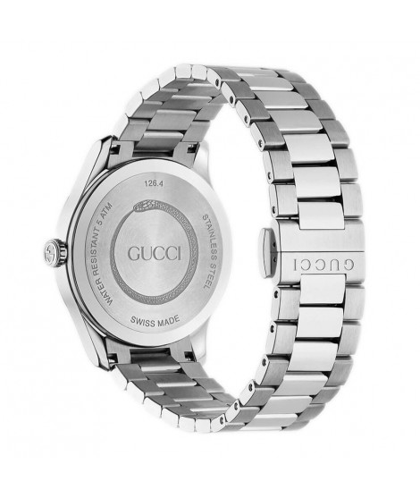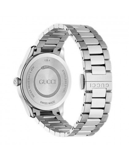 The Gucci men's watch from the G-Timeless YA1264125 collection is a model aimed at men who appreciate the highest quality watches, for those who want to stand out from the crowd, following the latest fashion trends. It fully reflects the classics of Italian style with a modern twist, which will work both day and night. The watch is powered by an accurate and precise quartz movement. A noteworthy detail is a spectacular accent in the form of an image of a tiger that beautifully adorns the central part of the round black dial. The dial is also protected by scratch-resistant sapphire crystal, covered with an anti-reflective coating to facilitate the readability of the time, even on very sunny days. The 38mm case is attached to a silver colored stainless steel bracelet. 5 ATM (50m) water resistance protects the watch from accidental splashes. With a 2 year warranty and an extra year on the movement, this is the perfect Gucci model for lovers of elegant watches.