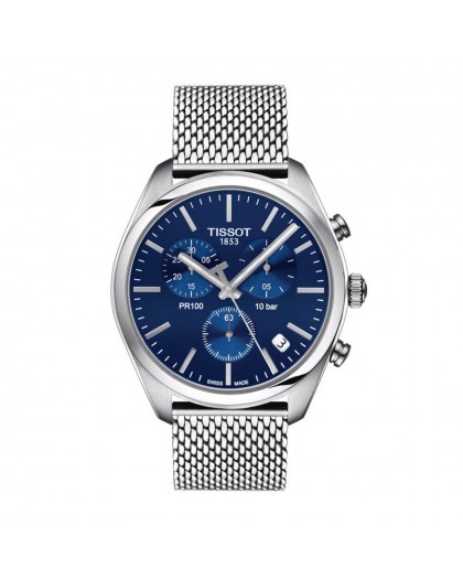 The men's watch from Tissot's solid, elegant and luxurious PR100 collection is a timeless model of high precision. A circular shaped stainless steel case with a mixed finish, a navy blue dial protected by an extremely hard and scratch-resistant sapphire crystal and a steel mesh strap with a jewelry safe clasp. In addition, it is water resistant to 100 meters. This unique watch is measured by a very precise quartz movement with a chronograph. It will work reliably in any situation!