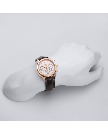 Men's watch from the Longines Heritage collection, model L27508762, has an automatic movement with a 54-hour power reserve and an important chronograph function. It is a reliable and extremely electrifying watch with extraordinary elements. The case is 18k rose gold with a sapphire crystal with a multilayer anti-reflective coating and the white dial has rose gold indexes and hands of the same color. The quality of the strap is captivating: it is made of brown alligator leather with a buckle. Thanks to the sapphire crystal caseback, the owner of this watch can see the movement from the bottom of the case. In addition, the watch has a date window positioned between 4 and 5 o'clock. The water resistance is 3 ATM. With a 2 year warranty and 1 extra year for the movement, this Longines watch is the perfect accessory for elegant and confident men!