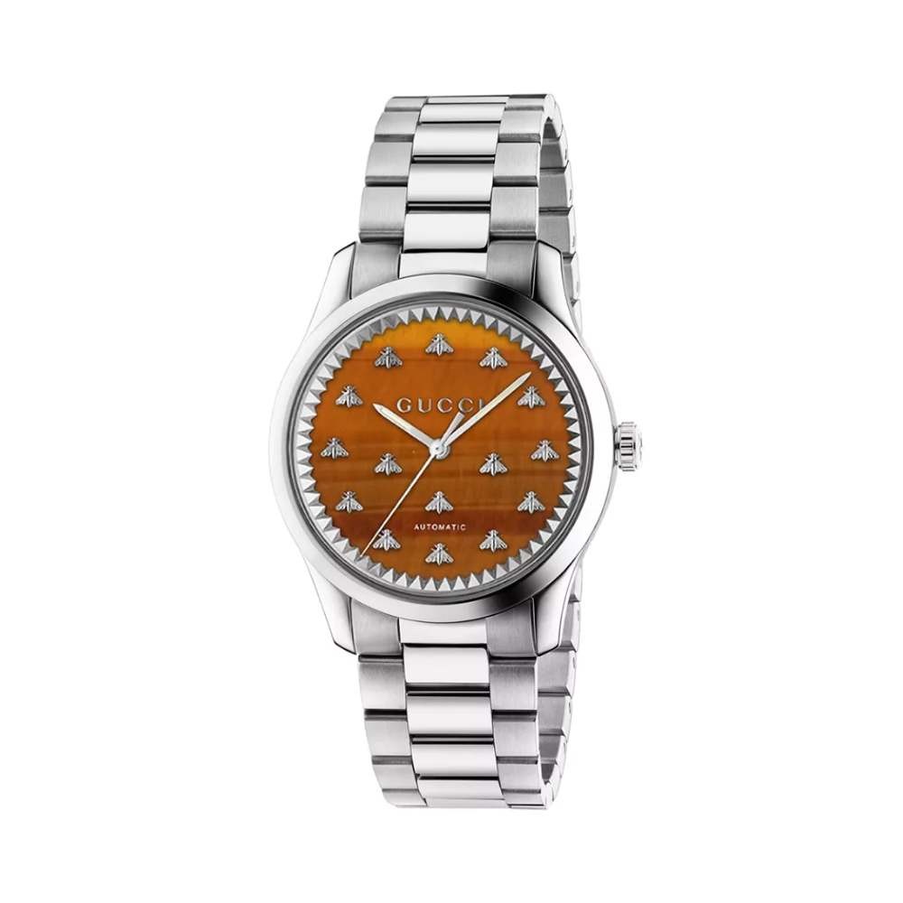 Orologi analogico unisex con movimento al quarzo Gucci G-Timeless YA1264177, cassa in acciaio inossidabile 38 mm, quadrante orange con api, vetro zaffiro trattato antiriflesso e antigraffio e con cinturino in acciaio