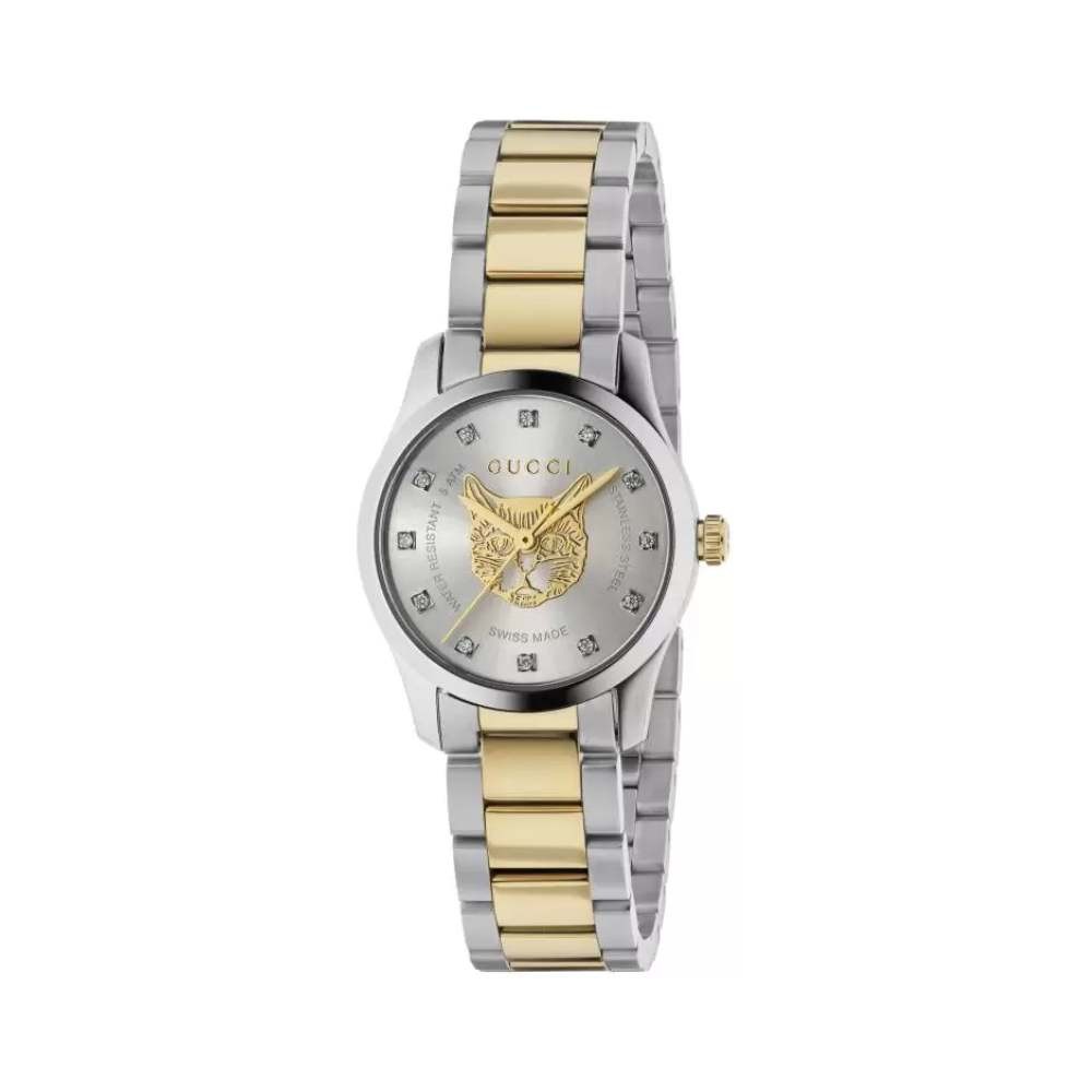 Orologi analogico unisex con movimento al quarzo Gucci G-Timeless YA1265016, cassa in acciaio inossidabile 38 mm, quadrante orange oro decorato, vetro zaffiro trattato antiriflesso e antigraffio e con cinturino in acciaio/oro