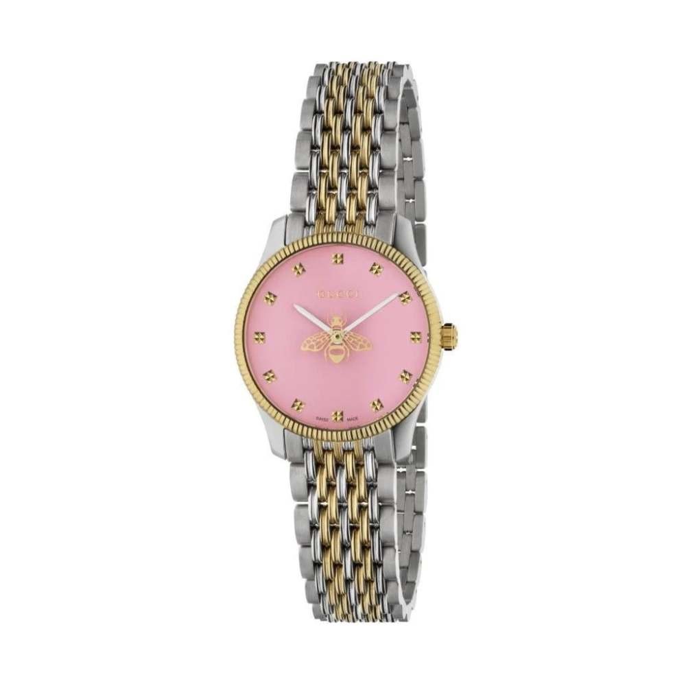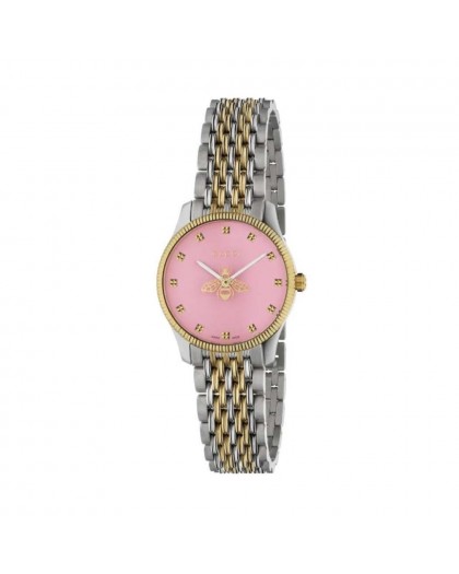 Orologio analogico da donna con movimento al quarzo Gucci G-Timeless YA1265030, cassa29 mm acciaio INOX PVD con ghiera color oro giallo, quadrante rosa, vetro zaffiro trattato antiriflesso e con cinturino in acciaio/oro