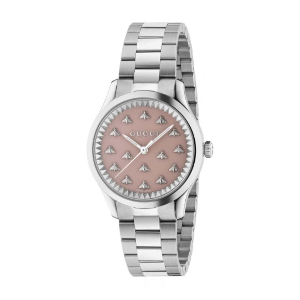 Orologi analogico da donna con movimento al quarzo Gucci G-Timeless YA1265031, cassa in acciaio inossidabile 32 mm, quadrante rosa con api, vetro minerale in zaffiro resistente e cinturino in acciaio