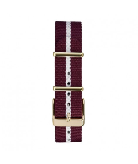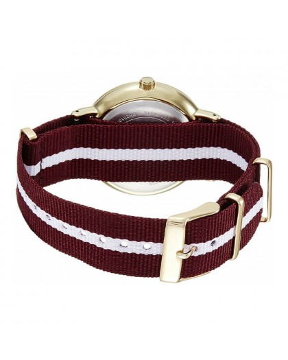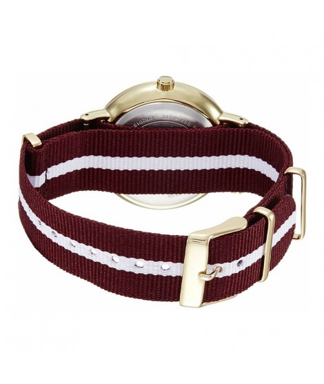 Orologio da donna solo tempo, collezione Timex Weekender. Cassa in acciaio di color oro e cinturino in tessuto bordeaux e bianco. Indici di colore dorato e quadrante bianco per una facile leggibilità