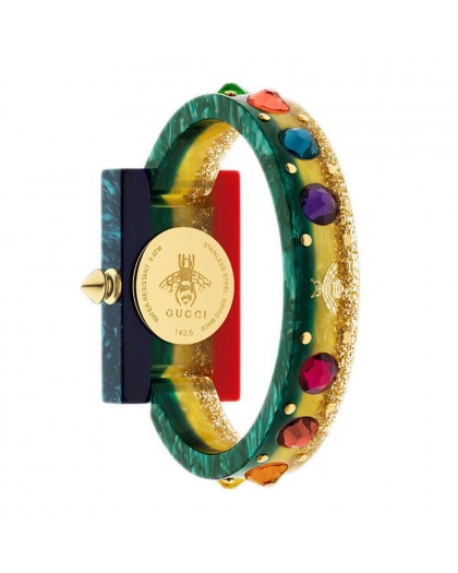 Orologio da donna della nuova collezione di Gucci con cassa in plexiglass colorato, come il cinturino.