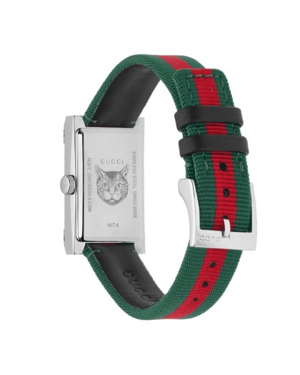Orologio della collezione G-Frame di Gucci, da donna, con cassa in acciaio dalla classica forma rettangolare. Quadrante bicolore verde e rosso come il cinturino in nylon.