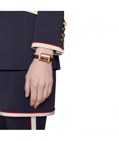 Orologio G-Frame di Gucci da donna con cassa in acciaio color oro dalla tipica forma rettangolare e cinturino in tinta col quadrante di colore blu, bianco e rosso. Resistente all'acqua fino a 30 m (3 ATM)