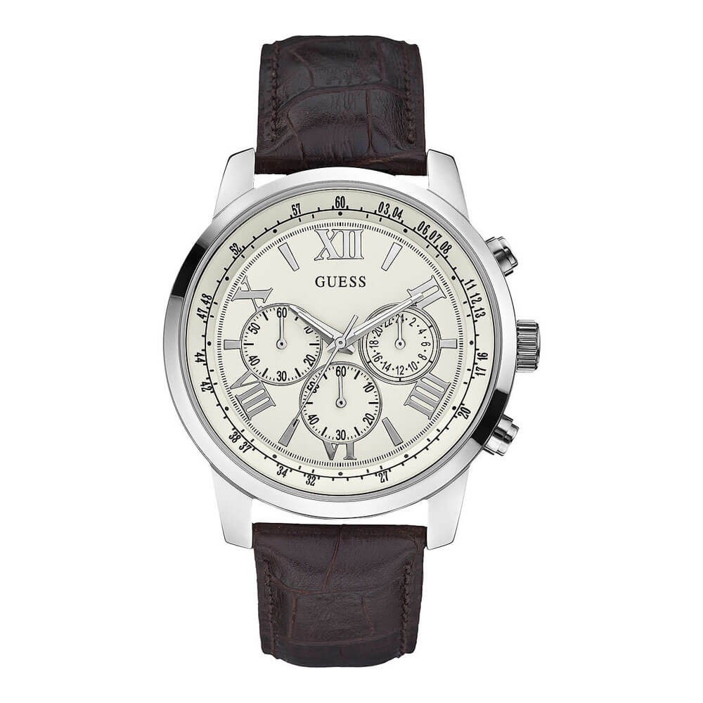 Męski kwarcowy chronograf marki Guess Horizon model W0380G2 : elegancki o silnym i modnym charakterze. Zegarek jest napędzany na dokładny mechanizm kwarcowy, natomiast klasa wodoszczelności jest na poziomie 5 ATM. Posiada bardzo przydatną funkcję chronografu. Koperta w okrągły kształcie o średnicy 46mm, jest wykonana ze srebrnej stali nierdzewnej i zamocowana na cudownym pasku z brązowej skóry. Tarcza w bieli, odznacza na swoim tle cyfry rzymskie pokryte w srebrnej powłoce. Zegarek posiada gwarancję na 2 lata z jednym dodatkowym rokiem na mechanizm. Dzięki zapakowaniu w orginalne pudełko, jest to idealna propozycja na prezent dla każdego eleganckiego mężczyzny.