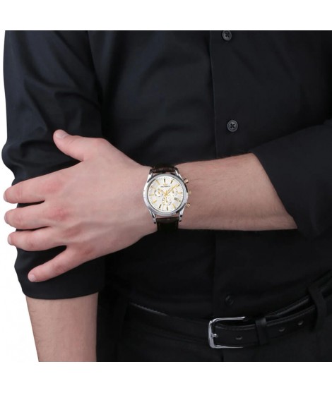 Elegancki, mocny, w ponadczasowym stylu vintage: taki jest zegarek marki PHILIP WATCH sunray R8271908002. W tym przypadku nieskazitelnie cudowny wygląd łączy się z nienaganną oraz wysoko jakościową technologią. Sercem czasomierza jest precyzyjny mechanizm kwarcowy. Klasa wodoszczelności jest na poziomie 10 ATM. Posiada ważną funkcję datownika na godzinie czwartej oraz jednakowo przydatną funkcję chronografu. Z punktu widzenia estetyki, koperta wykonane z silnej stali nierdzewnej w kolorze srebrnym jest zamocowana na cudownym pasku z brązowej skóry, natomiast tarcza cudownie odznacza na swoim tle jasne złote indeksy. Zegarek jest objęty 2-letnią gwarancją z jednym dodatkowym rokiem na mechanizm.
