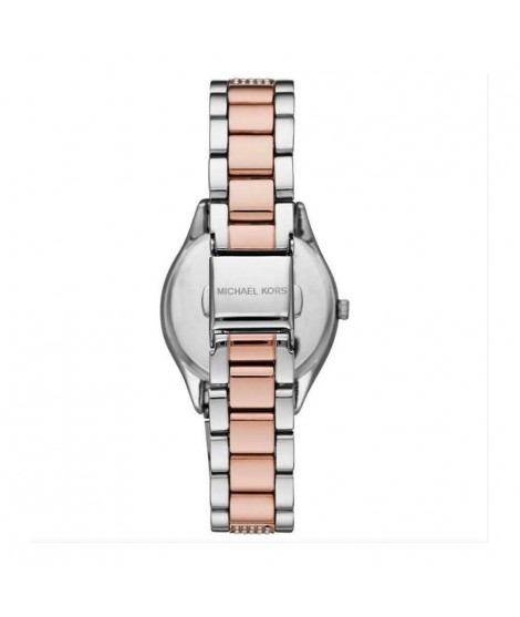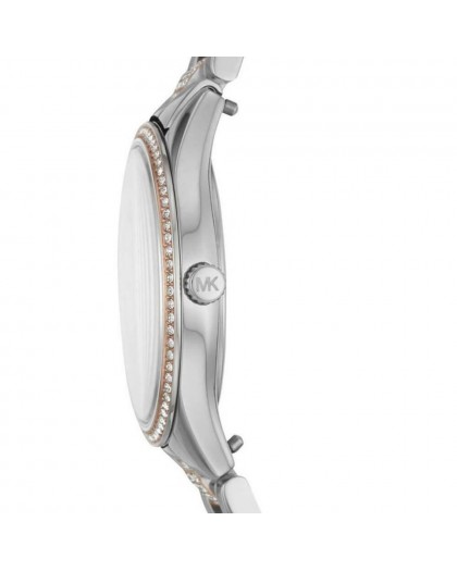 Michael Kors MK4366 to nieskazitelnie kobiecy zegarek, który dzięki swoim pięknym, błyszczącym detalom, może odgrywać rolę biżuterii. Lśniące cyrkonie zostały umieszczone na dwukolorowej bransolecie, na pierścieniu oraz na tarczy. Skradną serce każdej kobiety miłośniczki luksusu i prestiżu w eleganckiej odsłonie. Tarcza jest wykonana z jasnej masy perłowej która pięknie mieni się w blasku promieni słońca, a na jej tle godziny są oznaczone poprzez rzymskie cyfry oraz indkesy w różowo-złotej powłoce. Napędem na ten czasomierz jest nienaganny mechanizm kwarcowy, natomiast klasa wodoszczelności wynosi 5 ATM. Gwarancja wynosi 2 lata z jednym dodatkowym rokiem na mechanizm. Do produkcji zostało dołączone orginalne opakowanie. Jest to idealna propozycja zegarka dla kobiet ceniących sobie prestiż i elegancję.