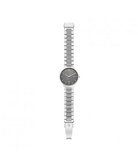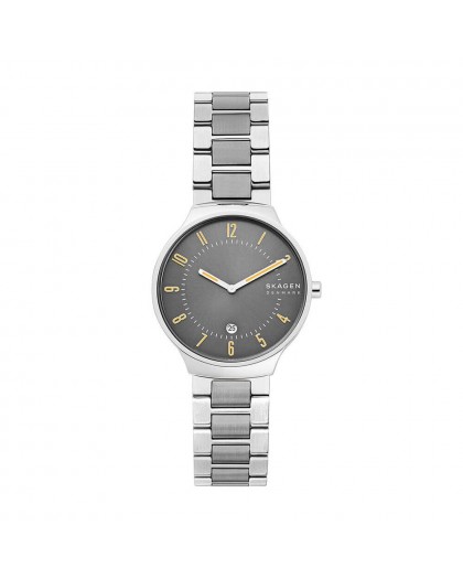 Skagen SKW6523: tajemnicza elegancja w subtelnym wykonaniu. Ten oto męski zegarek to idealna propozycja czasomierza dla Panów ceniących sobie eleganckie dodatki do użytku na co dzień jak i na wieczór. W tym wyjątkowym zegarku czas odmierza bardzo dokładny mechanizm kwarcowy a klasa wodoszczelności wynosi 50 m czyli 5 atmosfer. Z punktu widzenia estetyki, koperta jest w okrągłym kształcie ze srebrnej stali nierdzewnej, o średnicy 38 mm. Tarcza w interesującym szarym kolorze, posiada złote cyfry wyznaczające godziny oraz ważną funkcję datownika na godzinie szóstej. Jest dodatkowo chroniona poprzez utwardzone szkiełko mineralne. Całość został osadzona na klasyczny pasku ze stali nierdzewnej który idealnie dopasowuje się do nadgarstka. Posiada gwarancję na 2 lata z jednym dodatkowym rokiem na mechanzim.