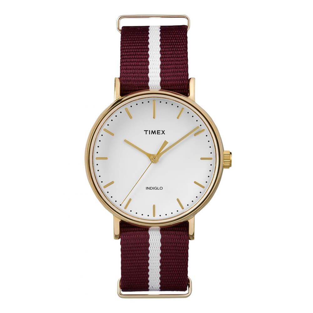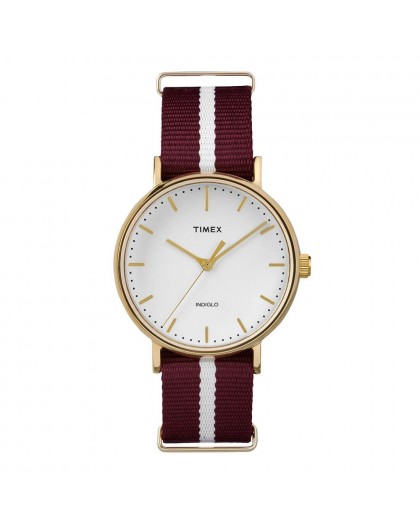 Zegarek Timex weekender TW2P98100 to niewątpliwie świetny gadżet dla każdej kobiety pragnącej wyróżnić się z tłumu. Jest to praktyczny a zarazem bardzo komfortowy czasomierz. Komfort jest zagwarantowany dzięki czerwono-białemu pasku NATO: lekki i bardzo wygodny oraz idealnie dopasowujący się do nadgarstka. Zestawiono go z okrągła, złotą kopertą ze stali nierdzewnej o średnicy 37 mm oraz białą, bardzo przejrzystą tarczą analogową, na której godziny są oznaczone poprzez delikatne indeksy oraz wskazówki w złotym kolorze. Sercem tego zegarka jest kwarcowy mechanizm a klasa wodoszczelności wynosi 3 ATM. Posiada gwarancję na 2 lata z jednym dodatkowym rokiem na mechanizm. Ten zegarek marki Timex to idealna propozycja dla osób orginalnych i śledzących trendy.